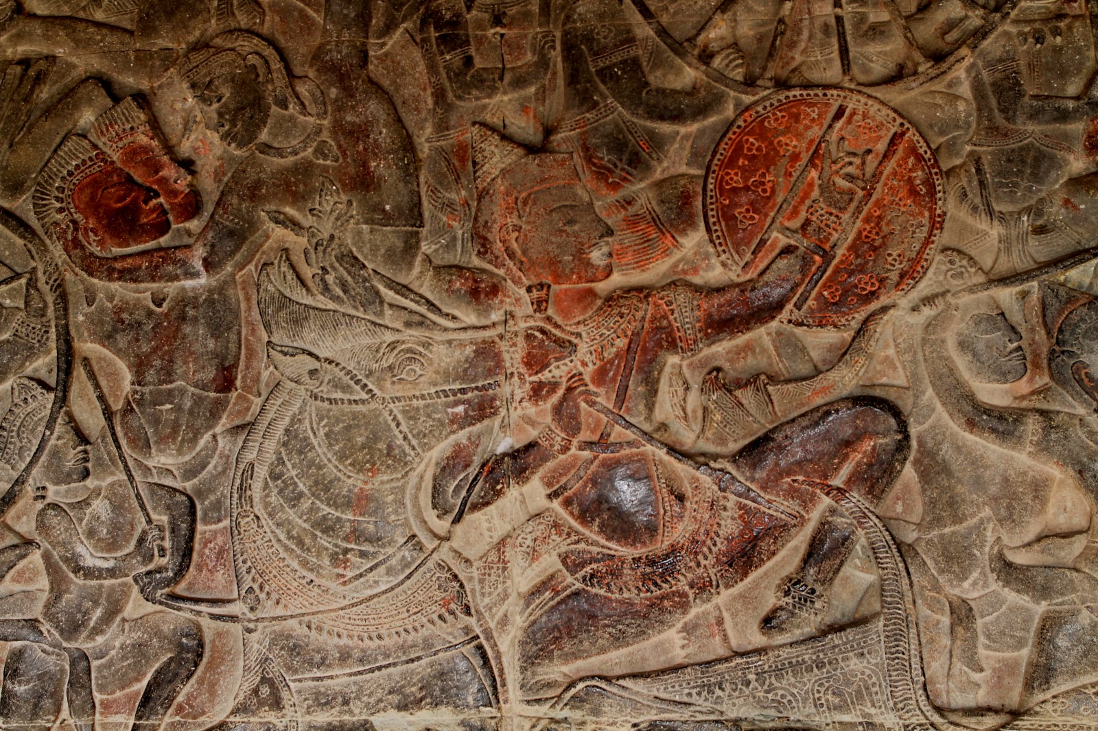 Besonders faszinierend fand ich die Anlage von Bantey Srei, die sich ebenfalls einige Kilometer abseits der Hauptheiligtümer befindet. Sie wurde der Legende nach von einem Brahmanen in Auftrag gegeben – als Priester und Gelehrter Angehöriger der höchsten indischen Kaste. Er war der Guru eines Herrschers von Angkor. Die Tempel sind mit lebendigen Darstellungen aus der Mahabharata geschmückt, einem der Epen in den Veden, den Ursprungstexten, auf denen der Hinduismus basiert. Mythologische Bilder mit Tempeltänzerinnen, Göttern und Dämonen schmücken die Tempel genauso wie Alltagsszenen.