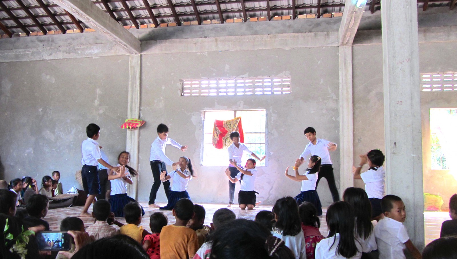 Nach einer ausführlichen Lautsprecher-Ansage führen die Schüler einen traditionellen Apsara-Tanz auf. Perfekt einstudiert und witzig, es geht unter anderem um eine Romanze unter Feldarbeitern.