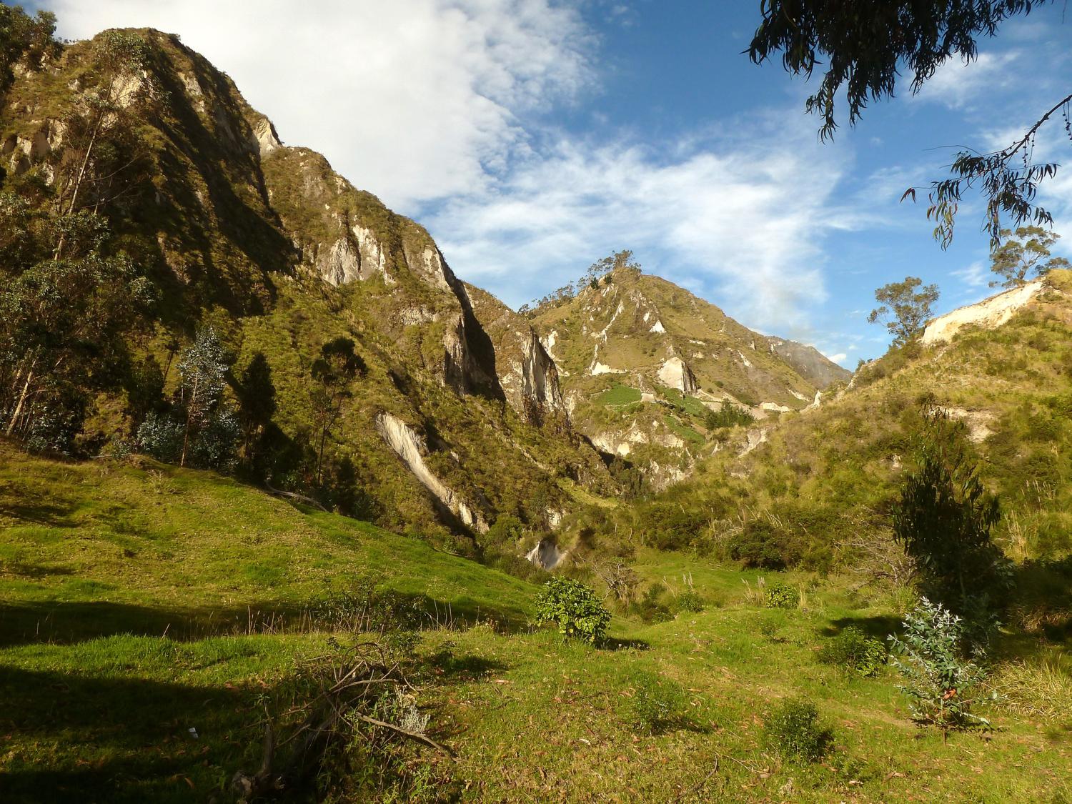 Die Luft riecht nach frischem Gras und Blüten, Schmetterlingen tanzen durch die Luft, Vögel zwitschern in den Bäumen. Unser Weg führt uns zu einsamen Bauernhäusern in traumhafter Kulisse und anschließend immer weiter bergab. Die Schlucht, die der Fluss Toachi ins Gebirge grub, müssen wir durchqueren. Immer tiefer steigen wir hinab. Der schmale Pfad windet sich an Felsvorsprüngen vorbei, verwandelt sich in matschigen Morast und lässt uns über lockere Steine stolpern.