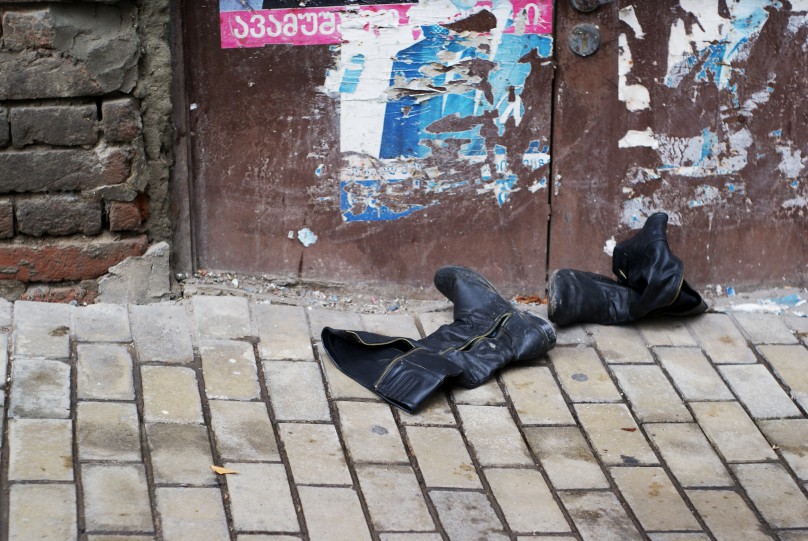 Am nächsten Morgen, oder eher Mittag, dann der erste Blick auf Tbilisi im Hellen, auf die merkwürdige Konstellation aus kleinen alten Häuschen, sowjetischen Prunkbauten und modernen Architekturexperimenten. Die Häuser in der Altstadt zeugen von früherer Schönheit, sind aber fast alle sehr schlecht erhalten. Aufgerissene Bürgersteige führen durch schmale Straßen, in denen die Balkone der gegenüberliegenden Gebäude sich fast zu berühren scheinen. Überall Kabelgewirr, dazwischen Wäsche, die zum Trocknen aufgehängt wurde, ab und an sieht man Hunde und Katzen durch die Straßen streunen. Die kunstvoll verzierten Balkone, die ganze Häuser umlaufen und offene Gänge darstellen, von denen die einzelnen Wohnungen abgehen, werden teils mit Holzbalken abgestützt, teils hängen sie halb schief oder haben schon vor Längerem begonnen, zu bröckeln. Dazwischen immer wieder komplette Häuserruinen.