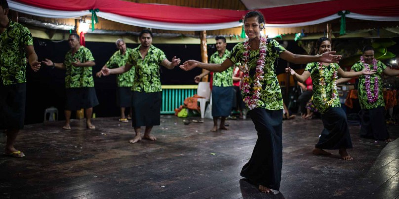Abends zur Fiafia-Nacht tauschen sie diese dann durch buntere und lässigere Textilien. Die typischen Blümchen-Hemden, wie man sie sonst aus der Karibik kennt, ersetzen dabei das weisse Festhemd.